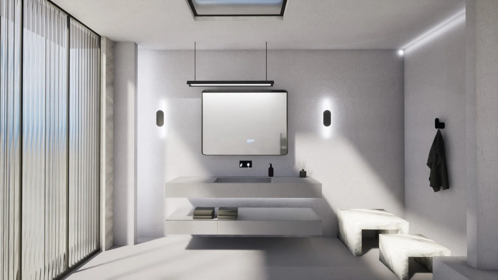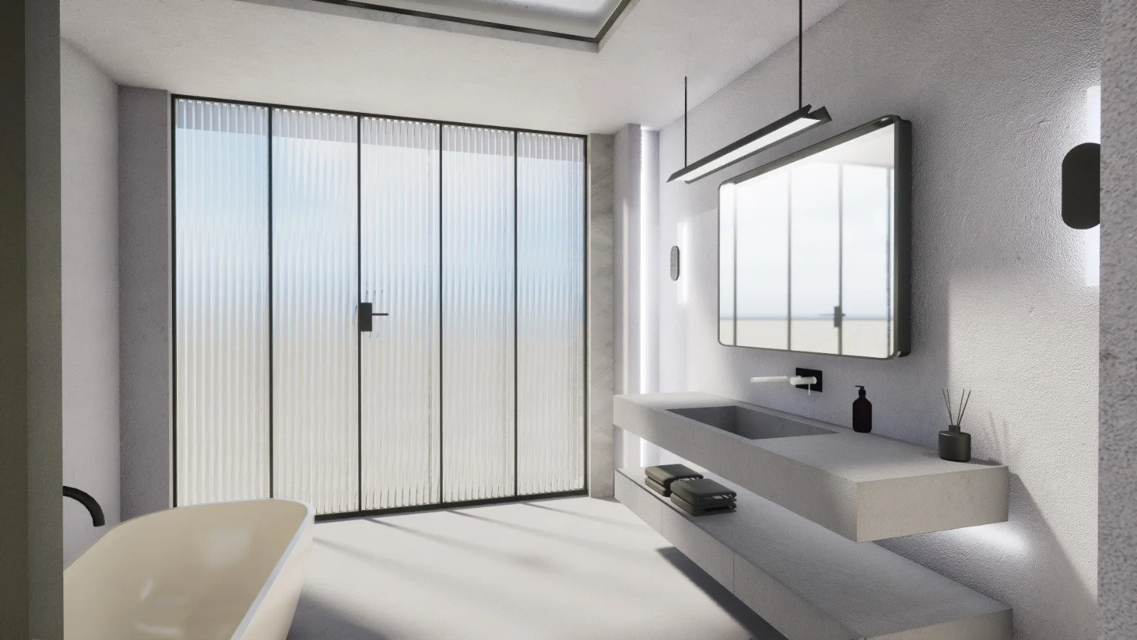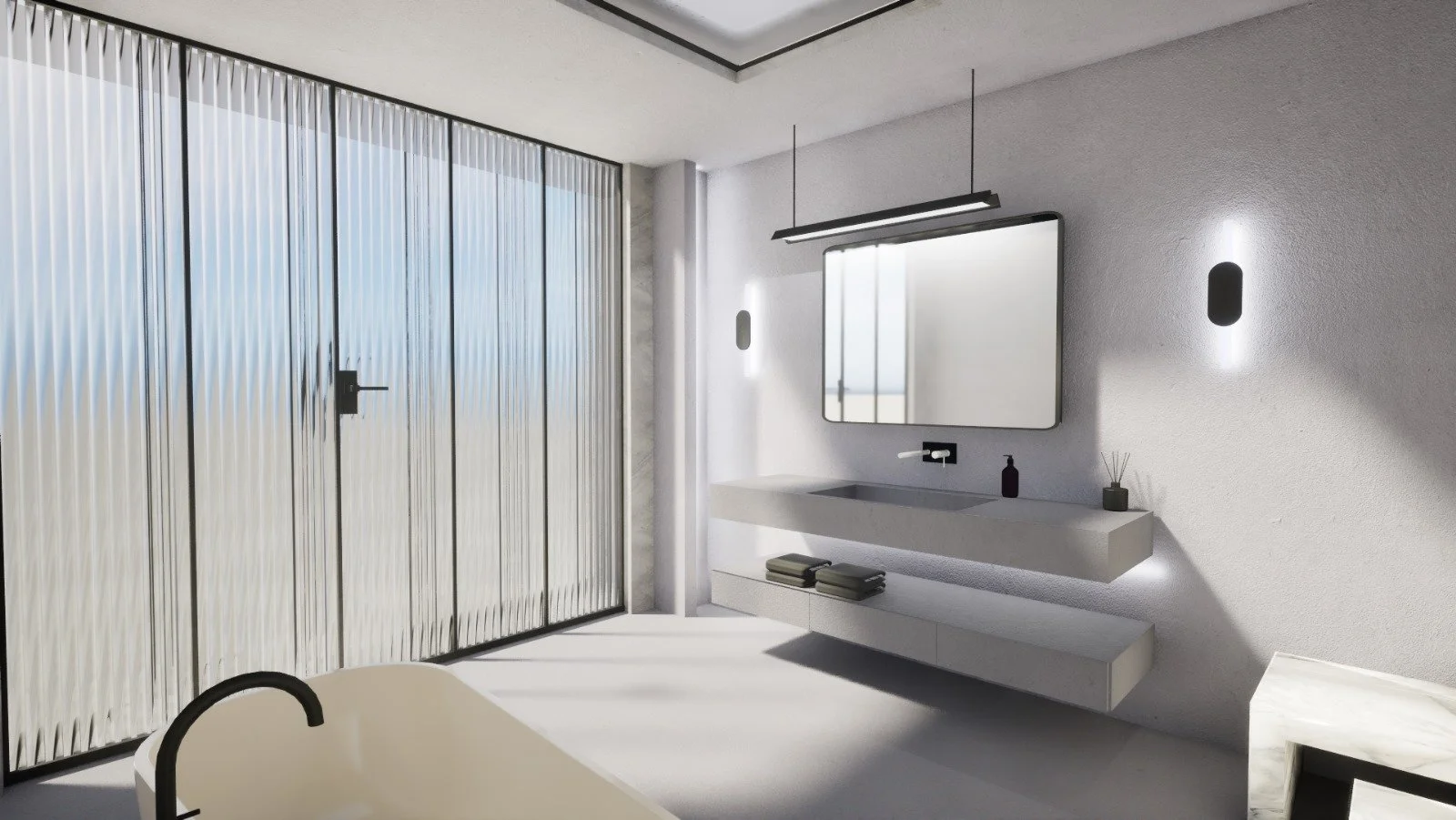 Private suite interior design renders. The client wanted a masculine luxury bathroom. Bathrooms are the oasis of the house, and deserve our extra attention. Adding a full glass wall was our favorite feature of this design.